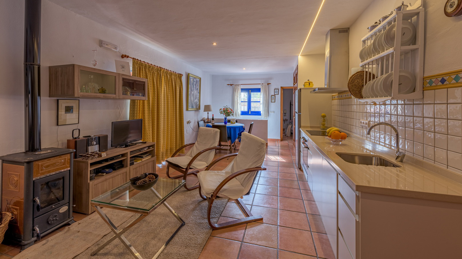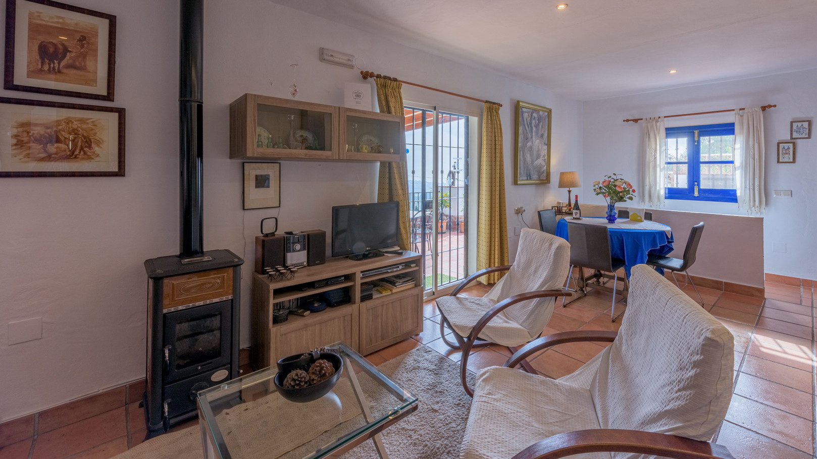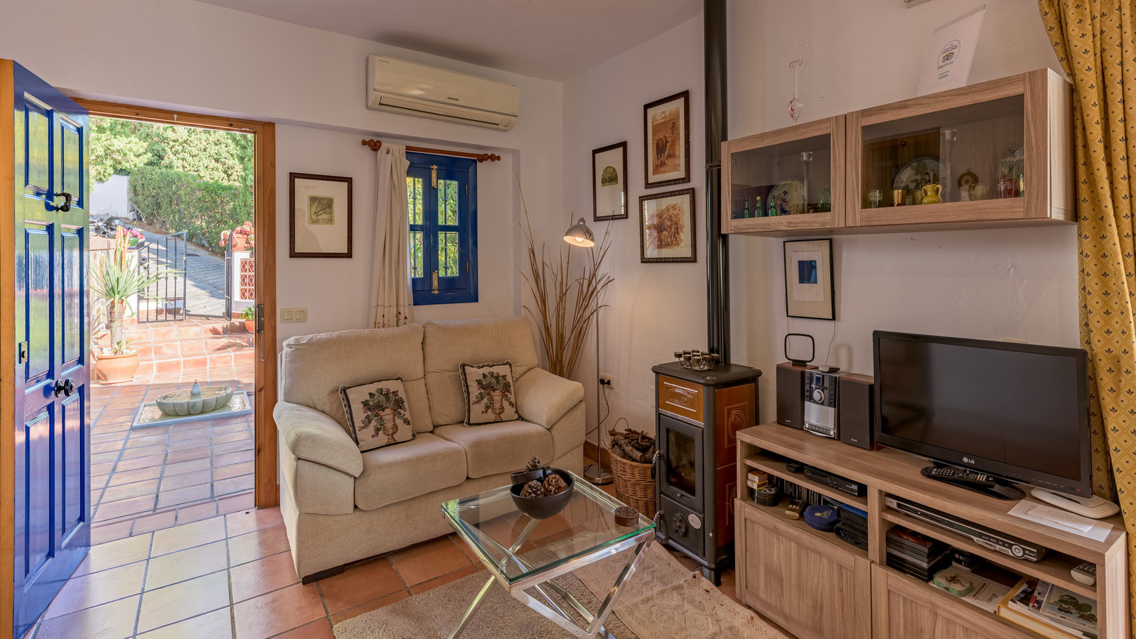 The dining area overlooks the entrance patio. The living room features a comfortable sofa, a practical armchair, a coffee table and a sideboard with television (English channels available). There is also a wood-burning stove.