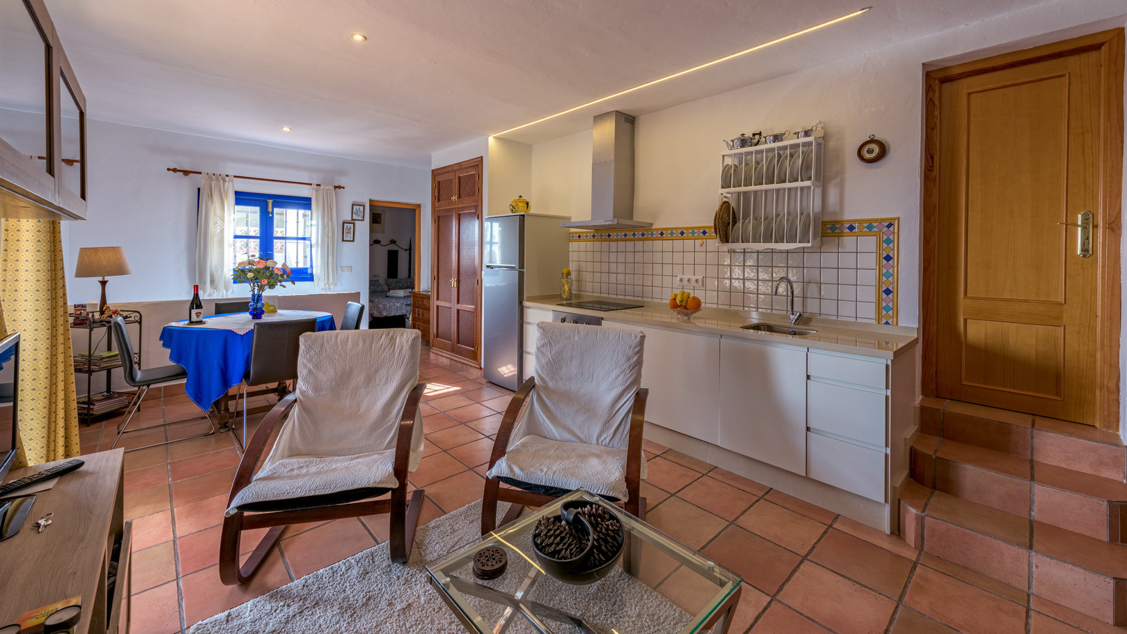 From the living room, a staircase leads down to the second bedroom, which has two single beds, a wardrobe and a bookcase with books in English and Spanish. This bedroom has its own en-suite bathroom. The kitchen is fully equipped.