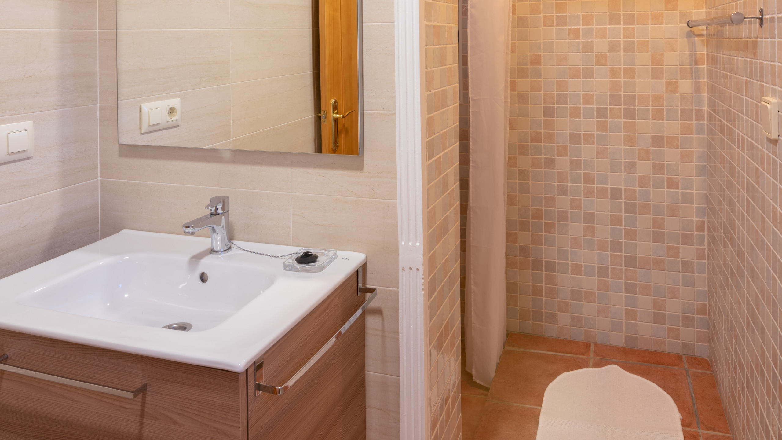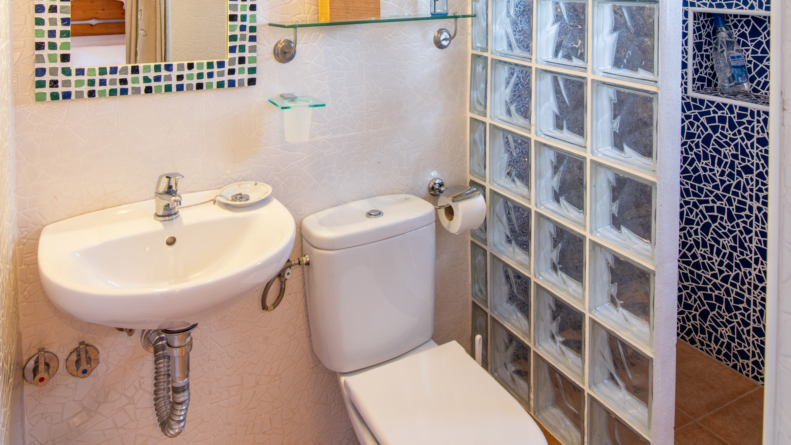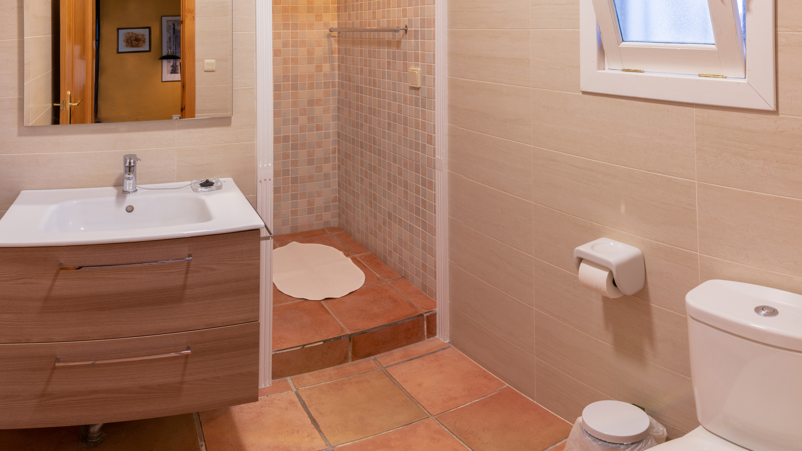 The bathroom is decorated with hand-finished tiles and includes a washbasin, toilet and shower (a hairdryer is also provided). Hot water is supplied by solar panels. The washing machine is located in the utility room.