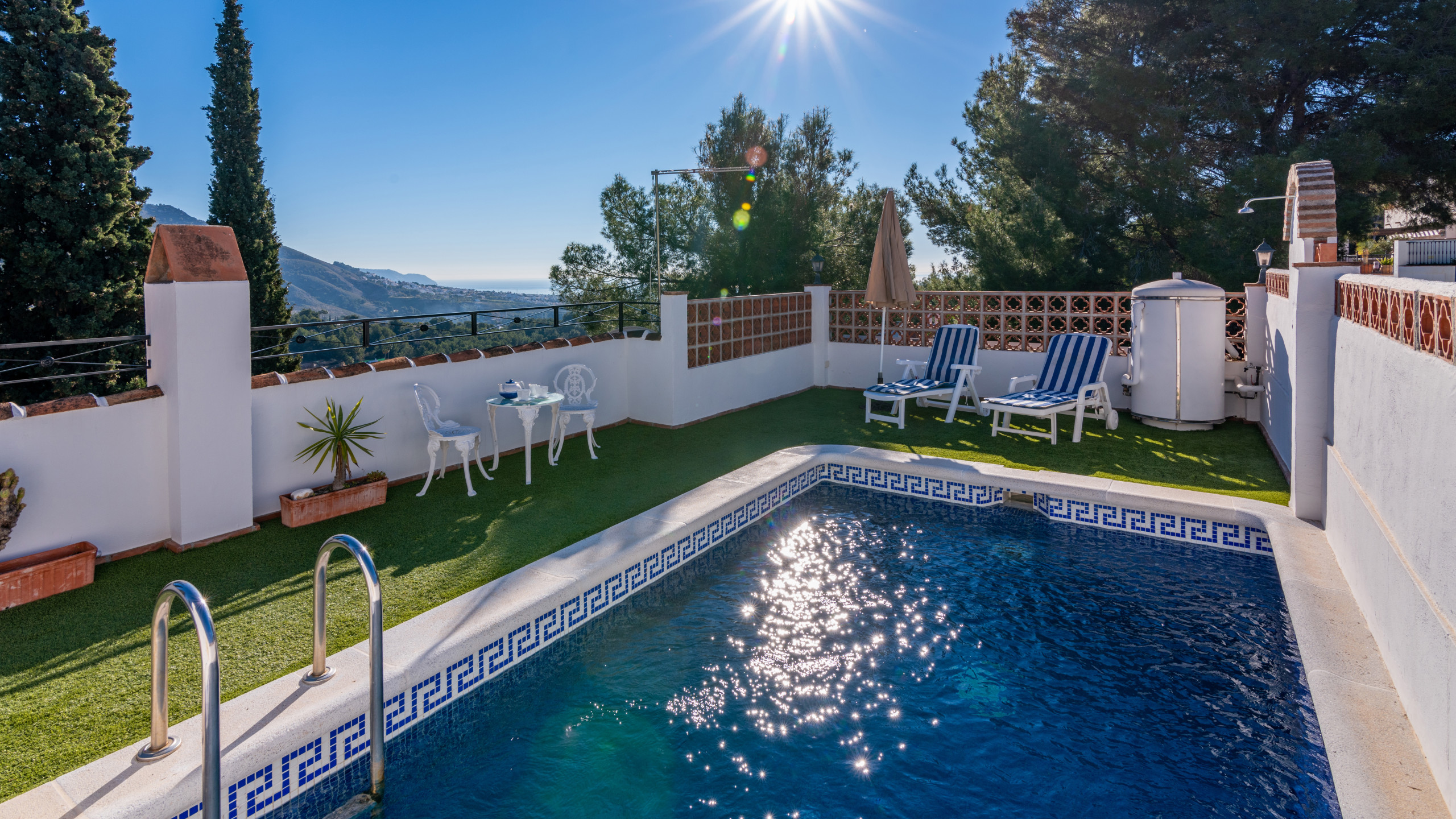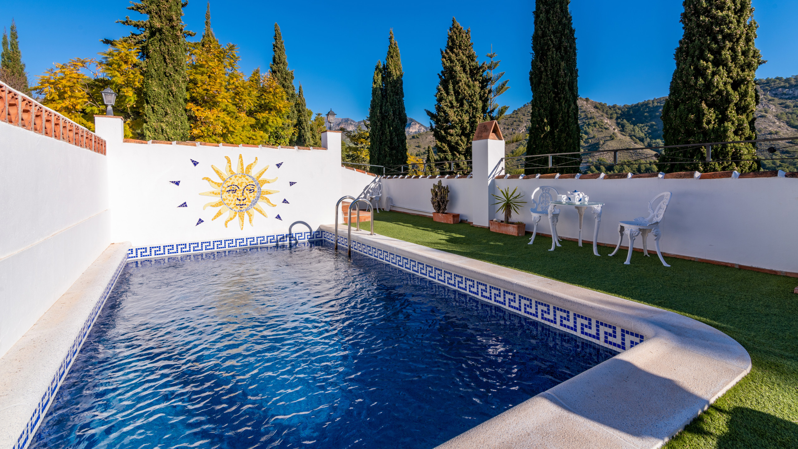 This is the ideal villa for outside living; you can cool off in your own private pool with roman steps (7m x 3.8m and 1.3m – 1.75m deep), enjoy a siesta at the shaded veranda or use the barbecue for your alfresco dinners. It will seem that sunny days never come to an end! The villa has a peaceful situation in the countryside, but is well accessed. If you are able to tear yourself away from this relaxing spot, then go visit the beautiful surrounding villages or experience the grandeur of Granada's splendid Alhambra Palace. For nights out, Nerja offers a fine selection of restaurants, tapa bars and opportunities to make a fiesta.