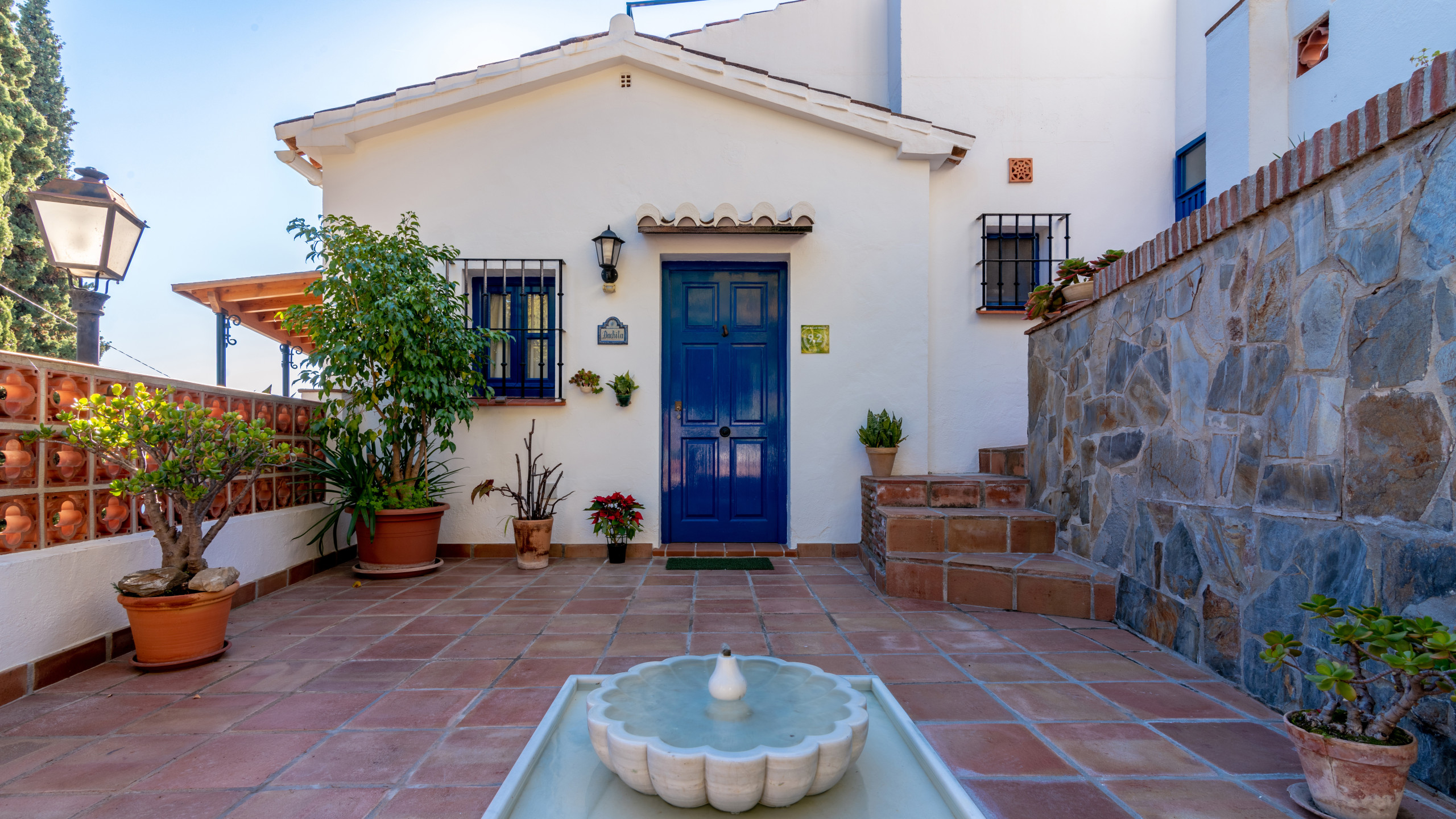 Access to the cottage is through a spacious, sunny patio paved with handmade bricks, decorated with flowerpots and a small garden on the right-hand side. The wooden front door, painted blue to match the window frames and give the house a truly Mediterranean feel, leads into the dining area, kitchen, living room and bathroom.