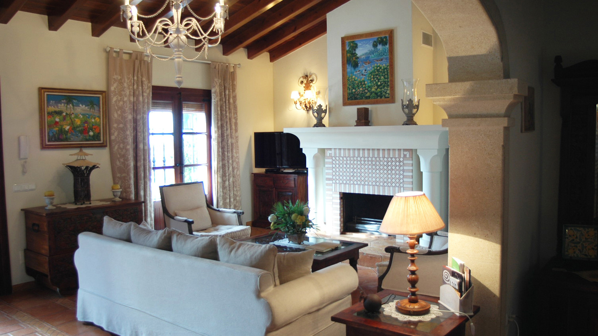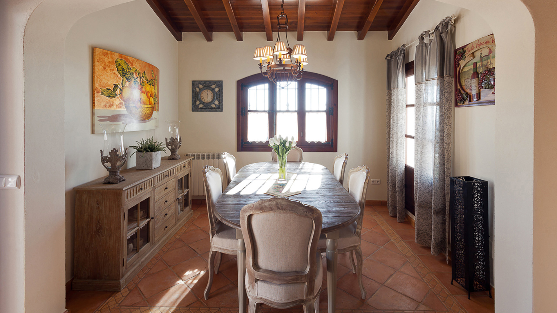 The living room has been decorated in a classical Spanish style with high ceilings and typical floor tiles. There is very comfortable seating and the open fireplace will warm up the villa on the cooler days in off-season, whilst the air conditioning will be a welcomed feature on the hotter days. Further amenities such as central heating, TV, and DVD player are available.