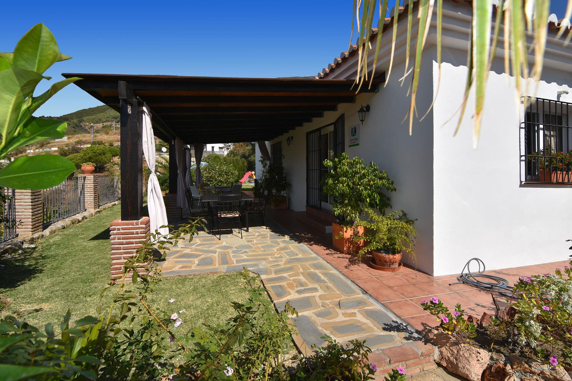 This delightful villa is truly the place for total rest and relaxation. The villa is set within a private residential area of the Valtocado Urbanization, at 4.6 Kms. west of Mijas Pueblo. Tucked away in the hills, it’s intimate and cosy, with a beautiful mature garden with a great variety of vegetation, including a “Madroño”, an evergreen shrub native to the Mediterranean region. A lawn area surrounds the splendid pool (9 x 4m long and 1.70m – 0.9m deep) and comes complete with sun loungers. There is also a small soccer goal to entertain the kids. The villa itself is located on a slightly higher level where you will also find a covered barbecue area with work top, water and power supply. Provided with a charcoal barbecue and patio furniture, it’s the ideal place for your alfresco diners. To the front of the villa is another sitting corner, a lovely place to end the day with a good book or perhaps a good Spanish wine.