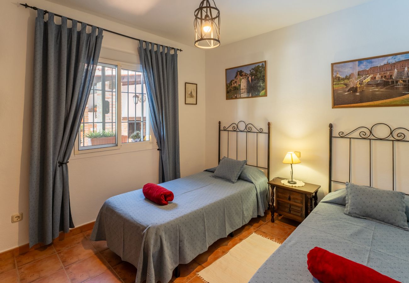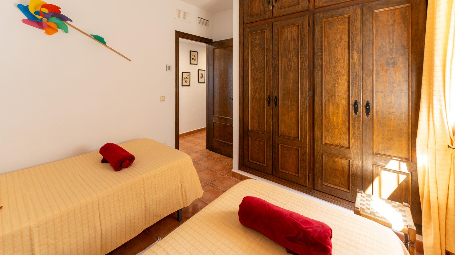 The dedication of the owners for the outside areas of this villa is also reflected in its interior. With all the rooms in a single floor, this it is a very comfortable villa with a lot of charm. The furniture and the decoration are of excellent quality and have been chosen with eye for detail, evoking a homely feel. From front terrace, the front door opens into the lounge, equipped with a sofa and arm chair, flat screen TV with satellite reception, DVD and Radio/CD player (please note that a new 32” flat screen TV has been installed recently, a little smaller than the one in the pictures). The lounge gives access to a cosy dining area, with dining table for 6, and the adjacent open-plan kitchen. The kitchen is decorated with use of wood and Andalusian tiling and well equipped with 4 rings gas hob, fridge/freezer, electric oven, microwave, washing machine and dishwasher. There are two twin bedrooms with wardrobe and a master double bedroom that makes use of the wardrobe in the adjacent corridor. There are 2 family bathrooms, both equipped with bath, separate shower, basin and WC.