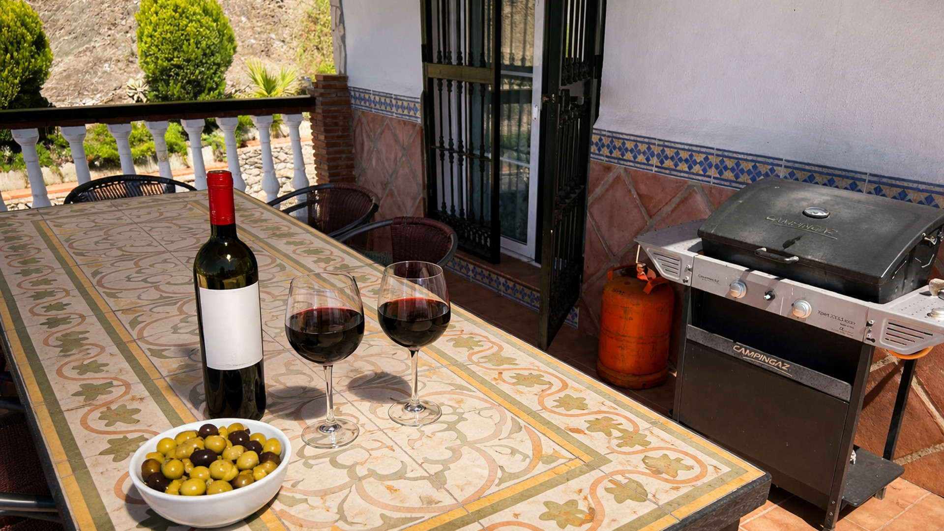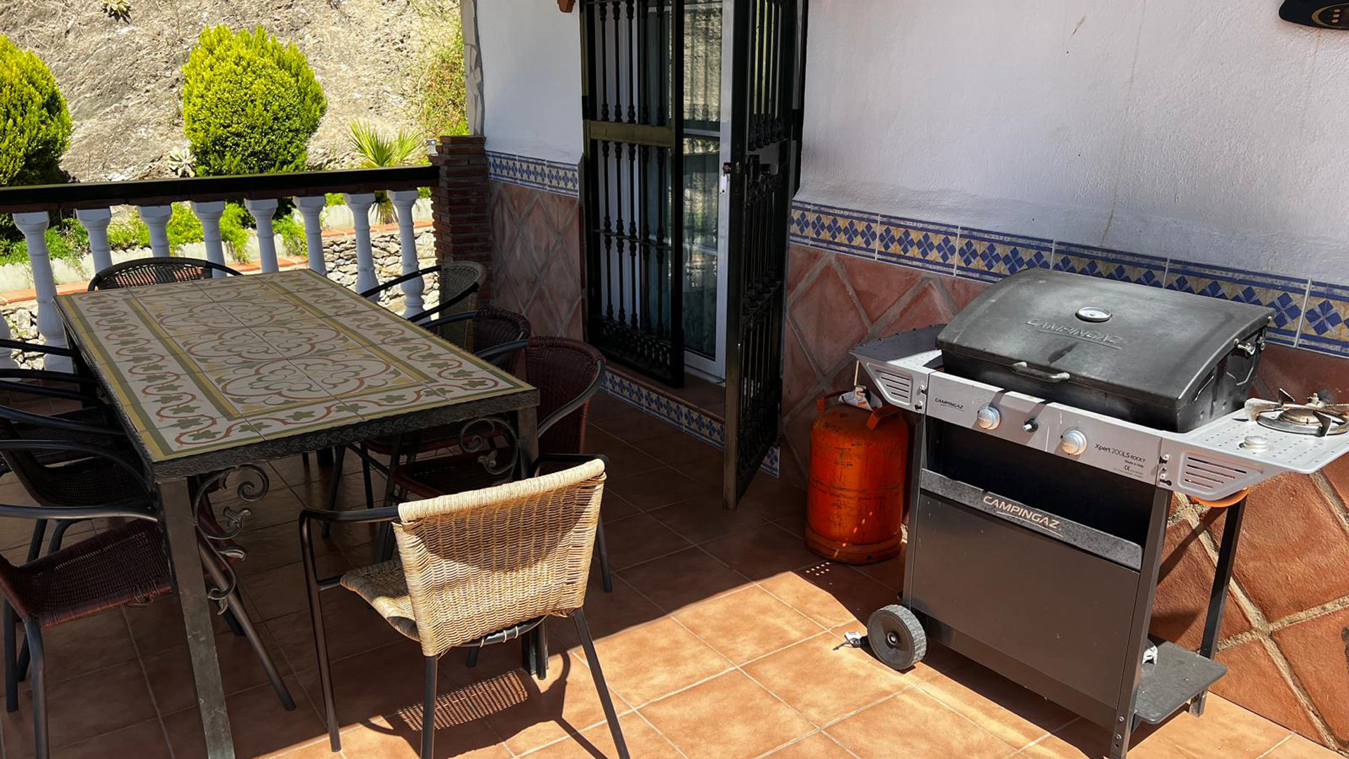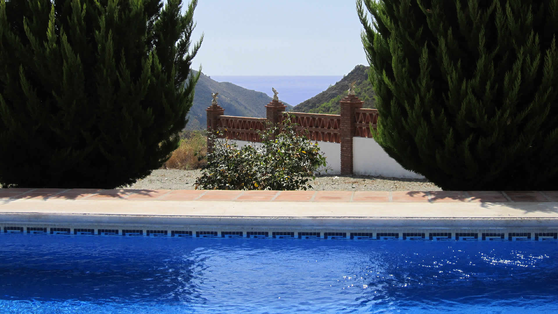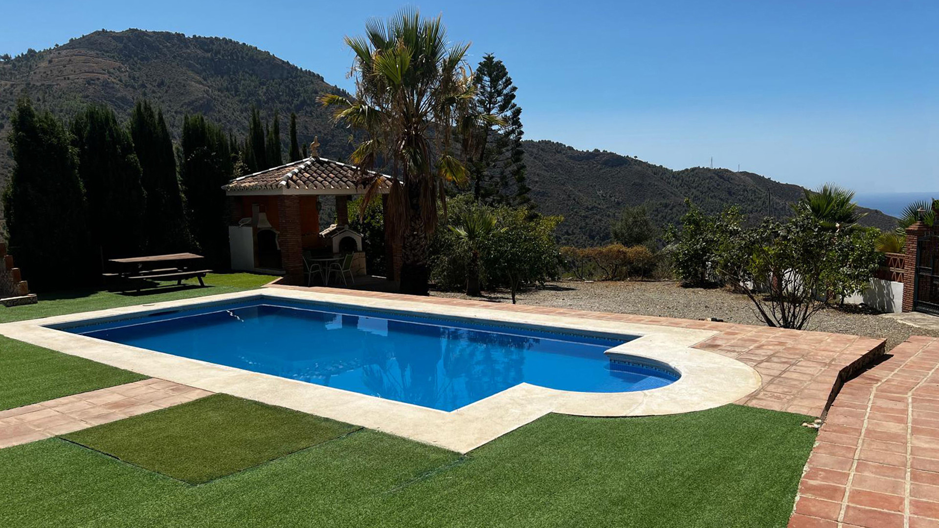 No rental car needed at this villa: it's only a 2 minute walk to restaurants, shops, tapas bars, and the beaches such as playa Carabeillo and playa Carabeo. Still the house does have its own private parking. In case you prefer to visit the highlights of Andalusia without driving then you can book a guided excursion or take public transport at the bus station only 800 m away. The villa is provided with a spacious terrace with sun loungers and private pool (6x8 m) and a smaller cocktail pool (You may ask what a cocktail pool is? Well, a cocktail pool is simply a pool providing the perfect place to lounge and have a cocktail or two.) A large sun screen covers the dining area making it a perfect spot to enjoy a lunch in the shade; a barbecue and patio furniture are provided. A few steps down from the sun terrace you will find a garden with lawn and exceptional views to the beach below. At the end of the garden there is a lovely chill-out area with garden chairs with ocean views to the Balcón de Europa.