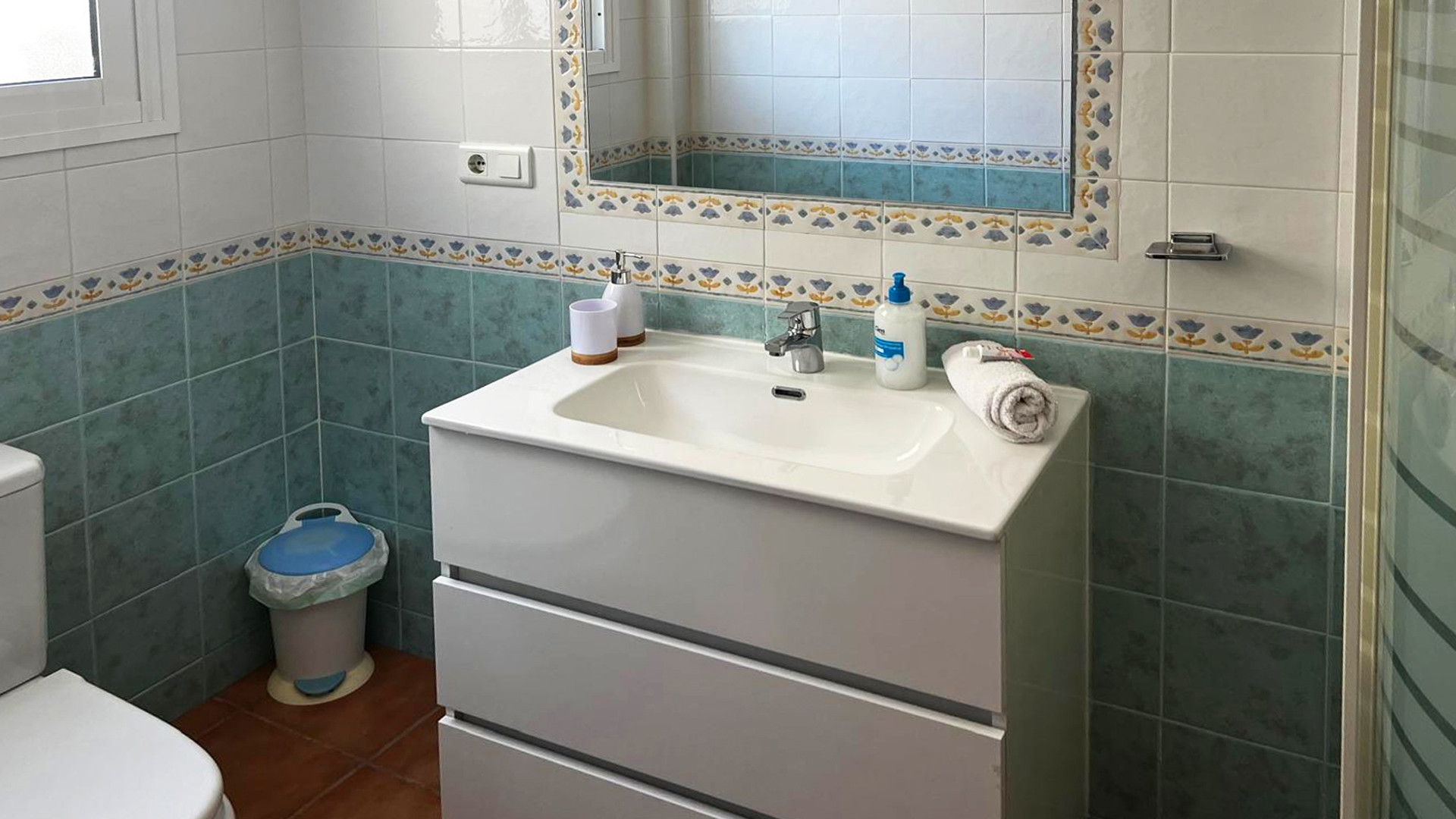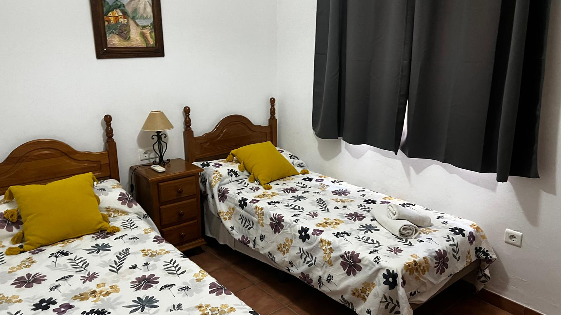 On the first floor there is a spacious master bedroom with a large walk-in wardrobe and a double bed. The ensuite bathroom is equipped with an over bath shower (with views to the Balcón de Europa!), WC, and basin. The third bedroom is provided with a double bed, a large LCD-TV, and a spacious private sun terrace with sea views. A bathroom with a double-sized bath, shower, WC, and 2 washbasins corresponds to this bedroom. The fourth bedroom is a twin that makes use of the fourth bathroom, fully equipped with over bath shower, WC, and basin.