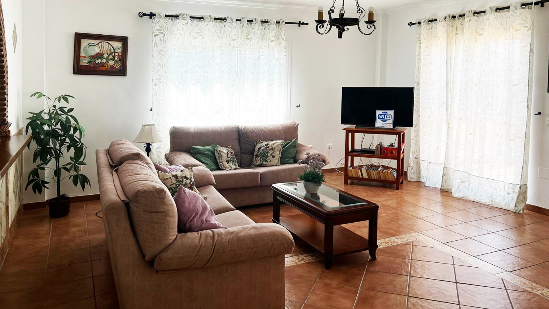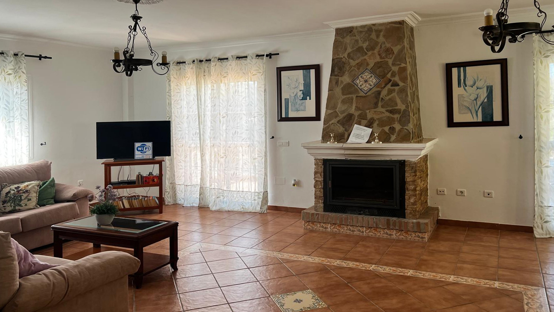The villa offers spacious accommodation, all on one level, decorated in a classic Spanish style. The cosy living and dining area features two sofas, an open fireplace, and satellite TV. A breakfast bar separates the living space from the well-equipped kitchen, which includes a ceramic hob, electric oven, microwave, fridge/freezer, washing machine, and dishwasher.