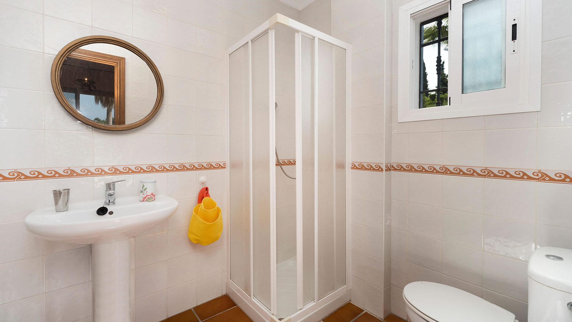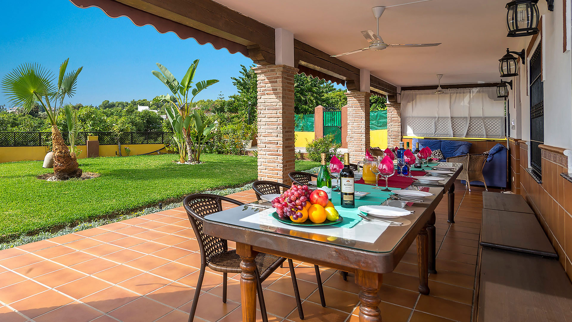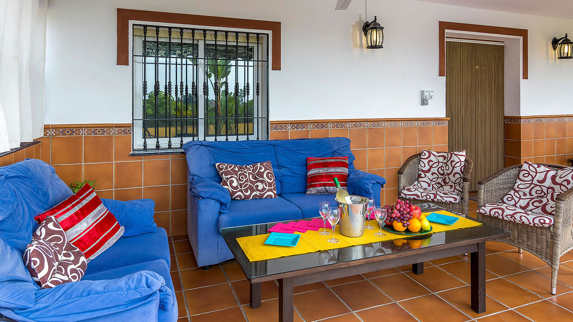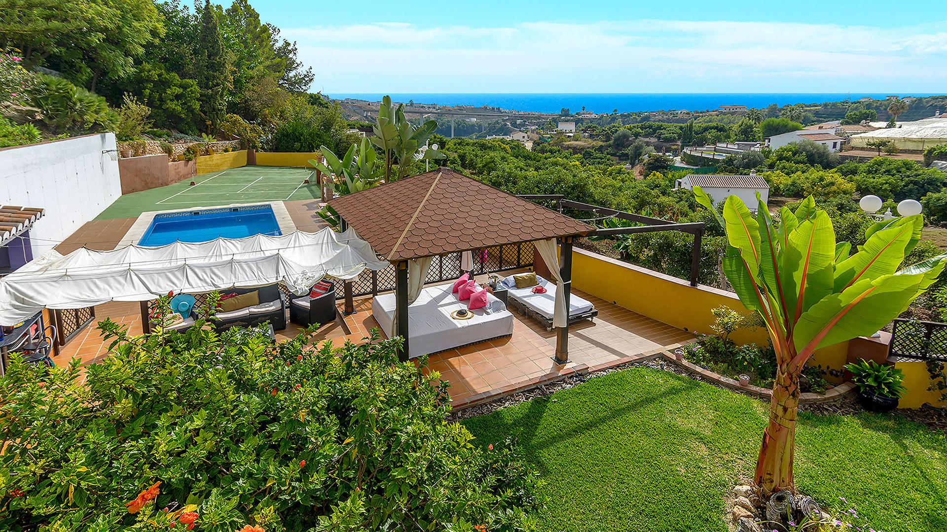 Its countryside location at 2.5 km northeast of Nerja provides peace and tranquility with facilities like supermarkets, restaurants, tapa bars and nightlife within easy reach by car. The secluded outside areas are set within a 2,600 m2 private estate and include a spacious garden with lawn and a private pool (9x5 m). The pool is fenced for extra child-safety. There is also a shaded verandah, ideal to enjoy your outside dinners or a lazy siesta. A barbecue is provided. The villa and its gardens offer splendid views on Nerja and the surroundings down to the Mediterranean.