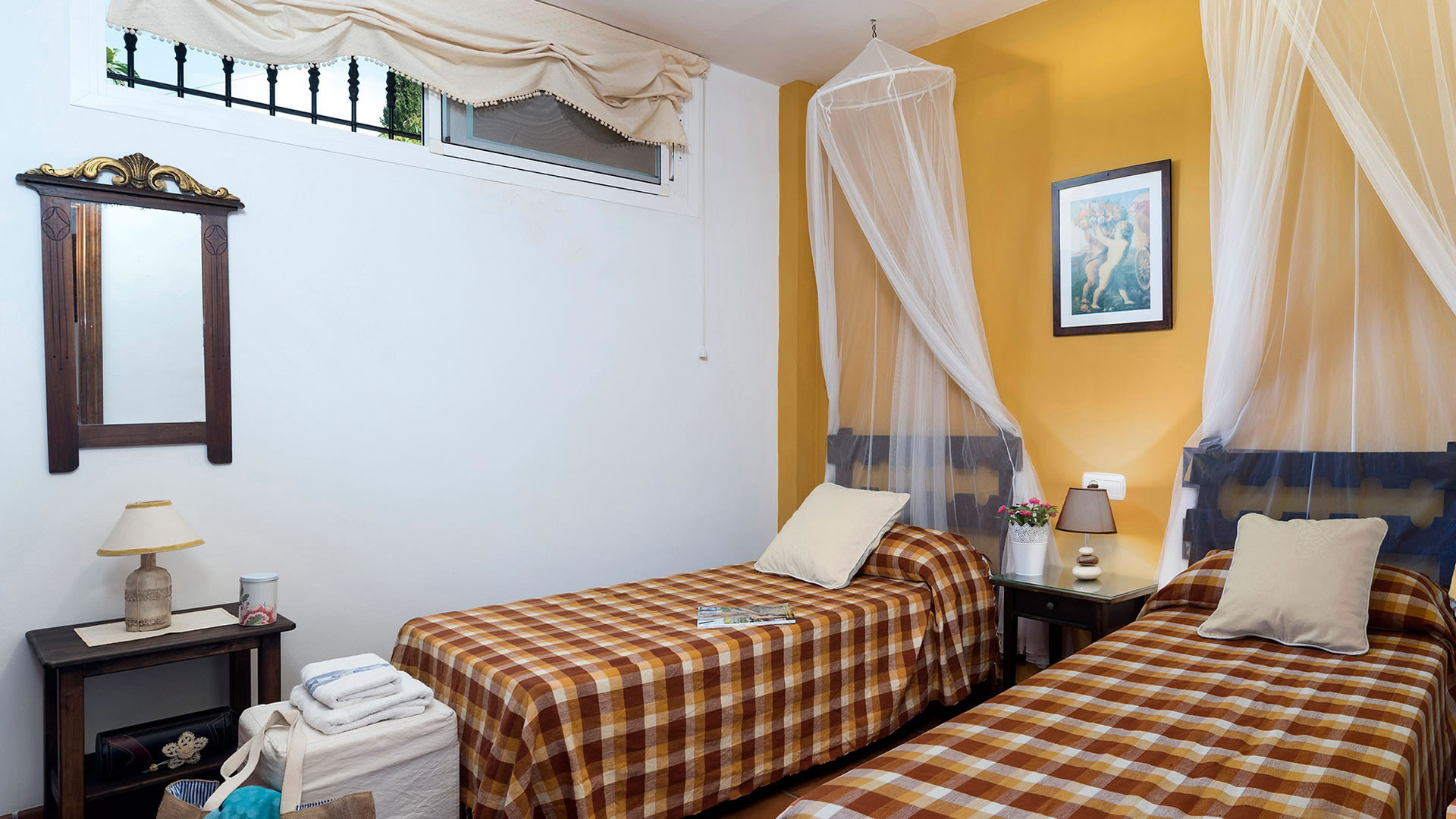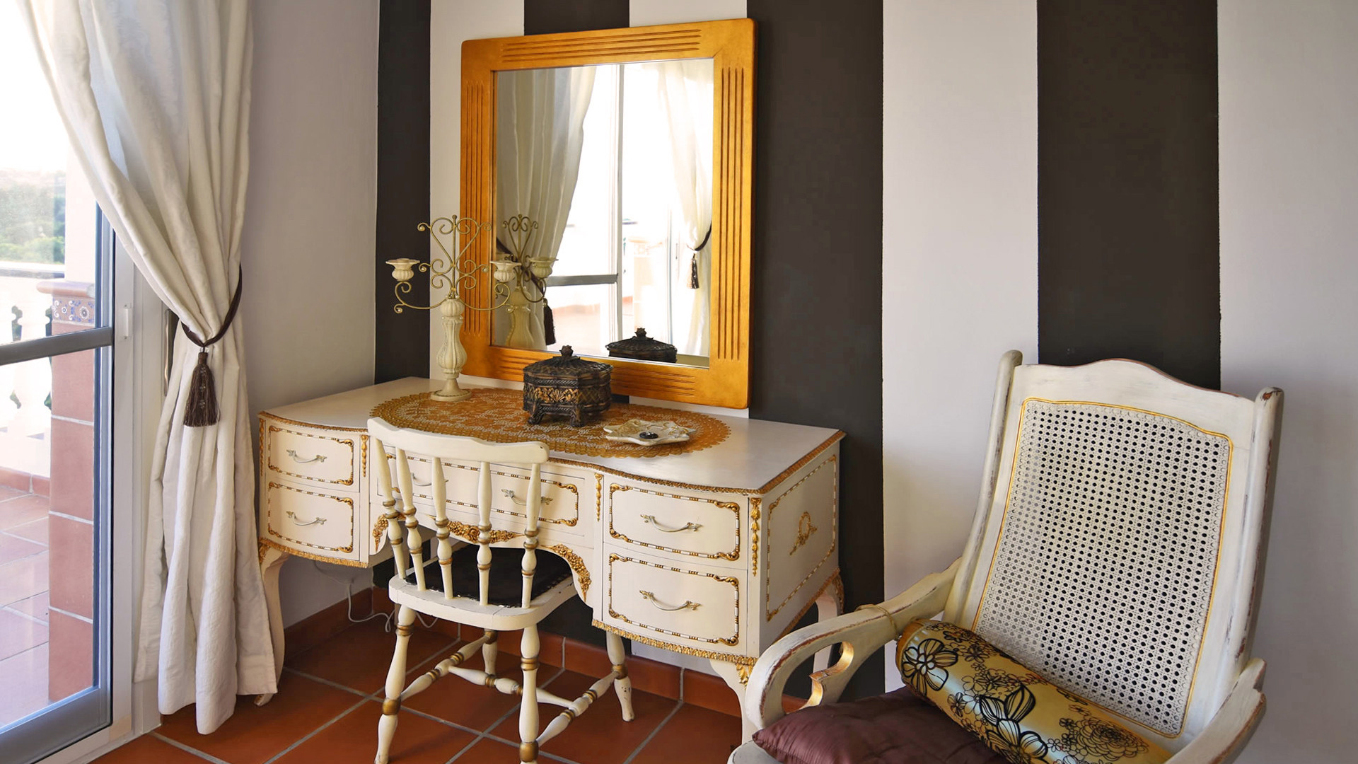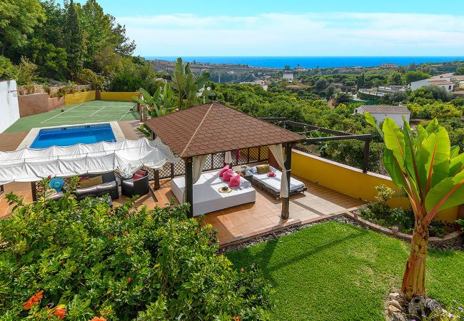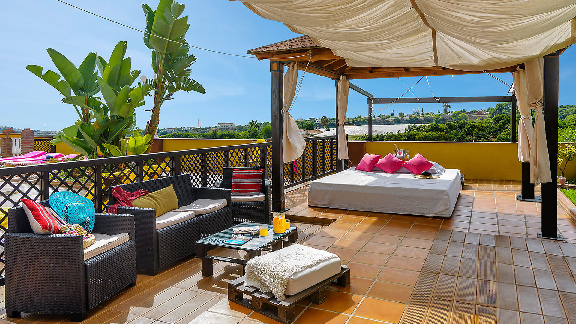 Its countryside location at 2.5 km northeast of Nerja provides peace and tranquility with facilities like supermarkets, restaurants, tapa bars and nightlife within easy reach by car. The secluded outside areas are set within a 2,600 m2 private estate and include a spacious garden with lawn and a private pool (9x5 m). The pool is fenced for extra child-safety. There is also a shaded verandah, ideal to enjoy your outside dinners or a lazy siesta. A barbecue is provided. The villa and its gardens offer splendid views on Nerja and the surroundings down to the Mediterranean.