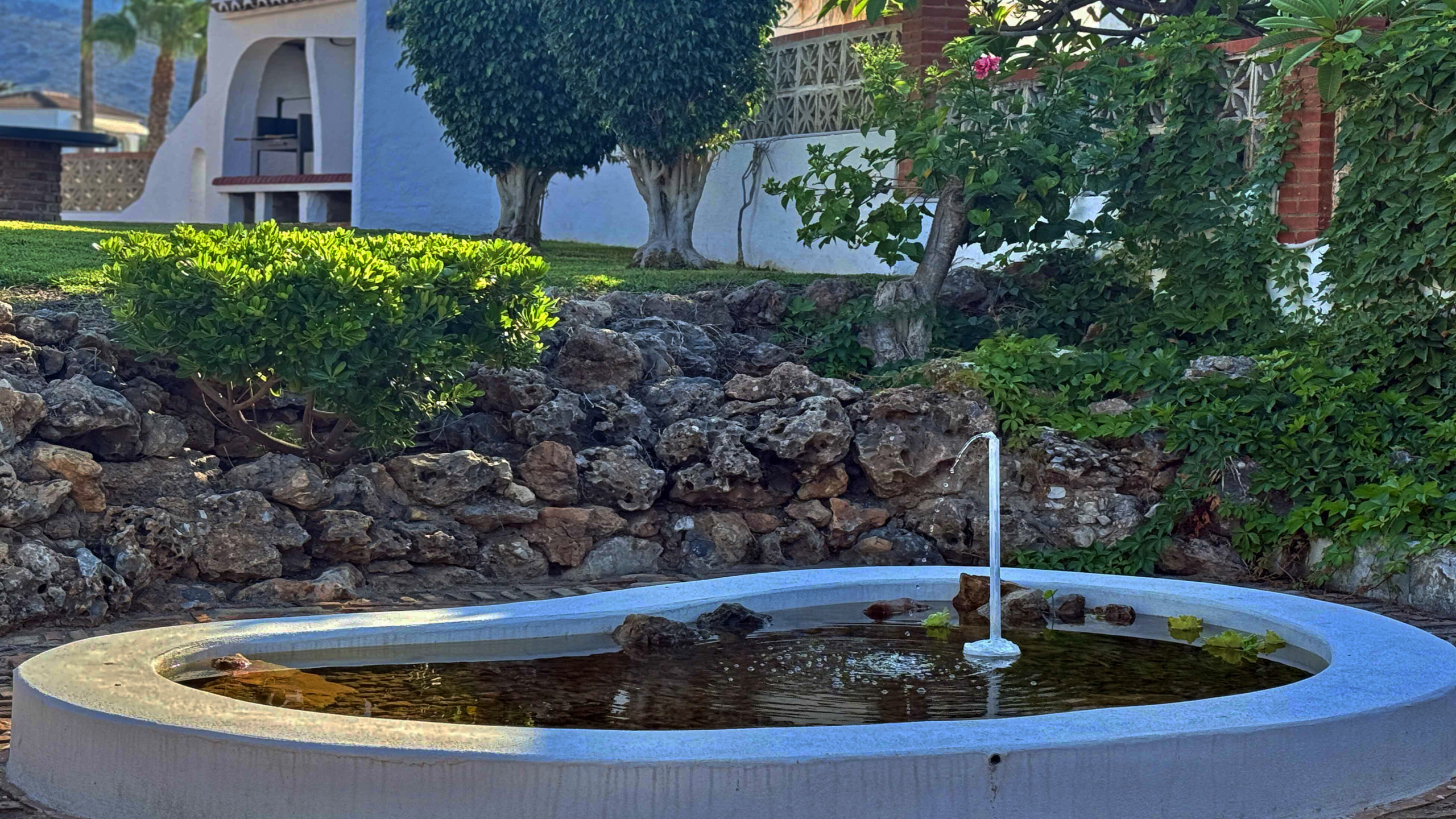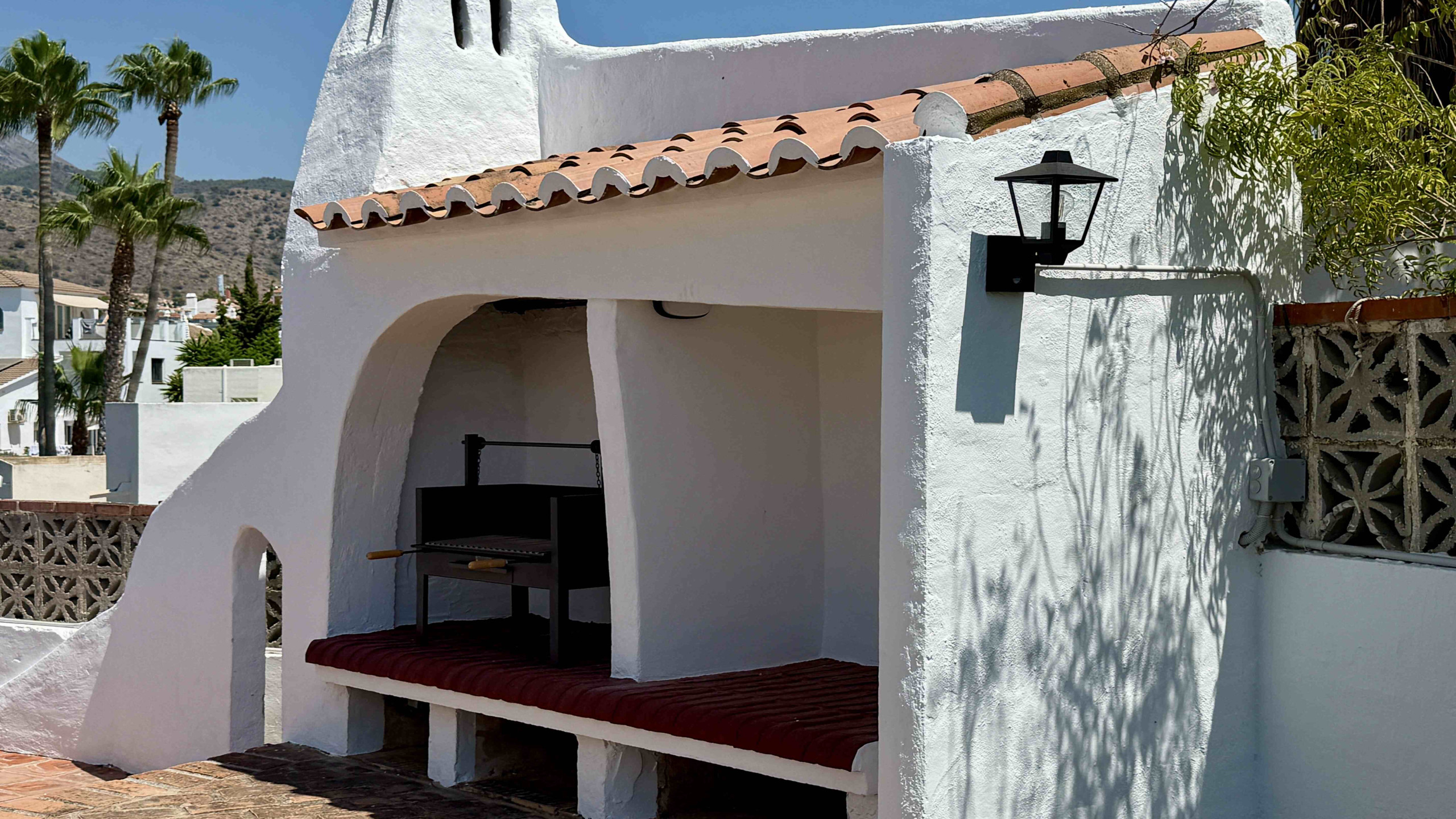 The villa is located on Jara St., in a quiet residential area approximately 1.7 km north of Nerja’s well-known Burriana beach and old town-centre where you will find a spectrum of tapa-bars and restaurants and a vibrant nightlife. For those who would like to get acquainted with the Andalucian heritage, the city of Granada with the Moorish Alhambra palace is an absolute must-see. Even closer, you can visit the impressive caves of Nerja or the beautiful white villages in the area such as Frigiliana and Competa. If you’d rather stay home, then you will enjoy the attractive private pool (8x4 m) set in a lovely garden with lawn. Sun loungers are provided and there is also a barbecue for your al fresco dinners. The outside dining table is set in a shaded space with an additional sitting area with beautiful seats made out of stone and using the villa wall for back rest—a lovely place for a cocktail or a sangria party! There is parking space on the public road alongside the house.