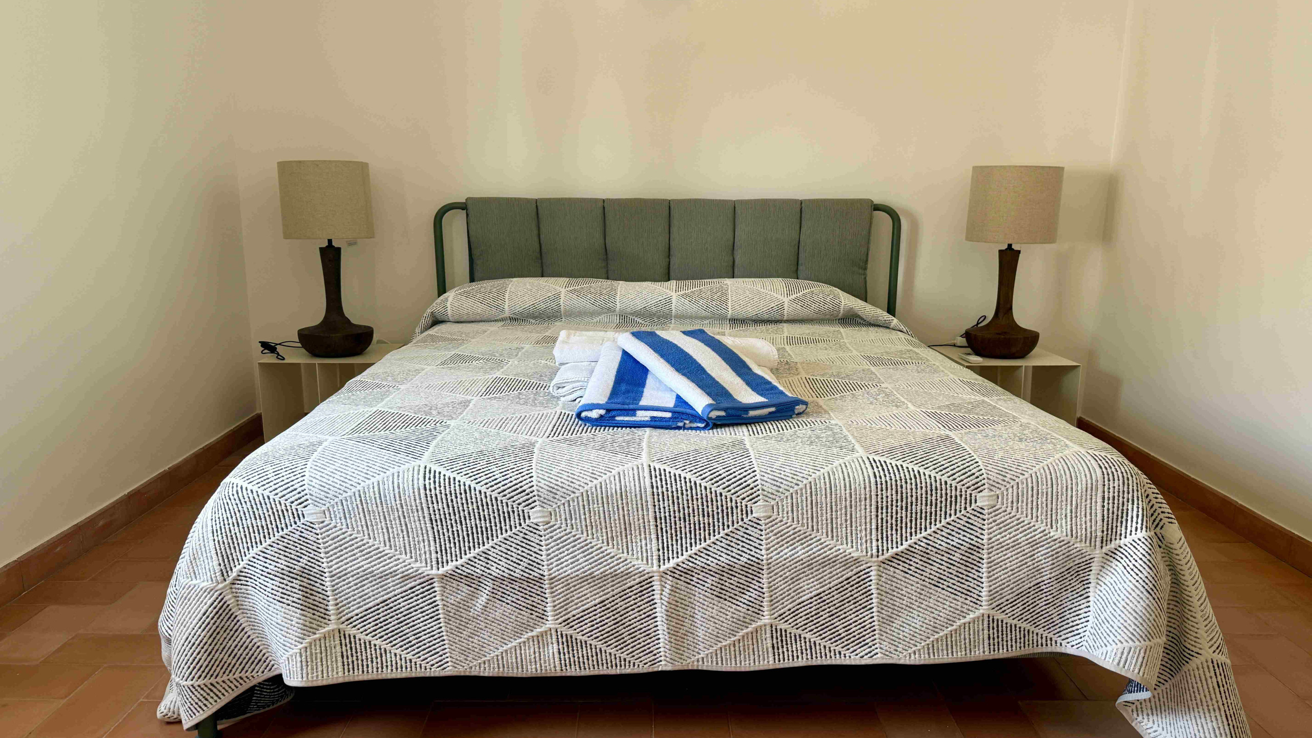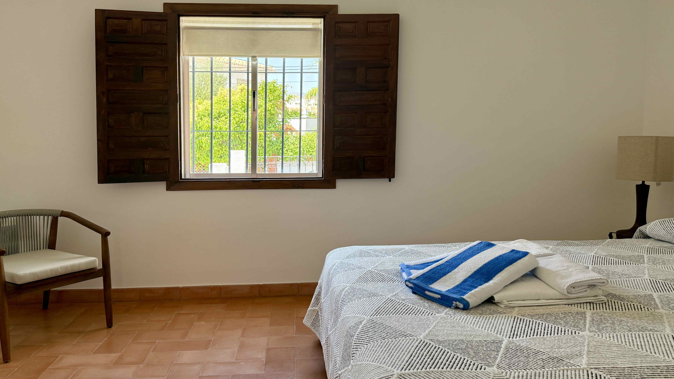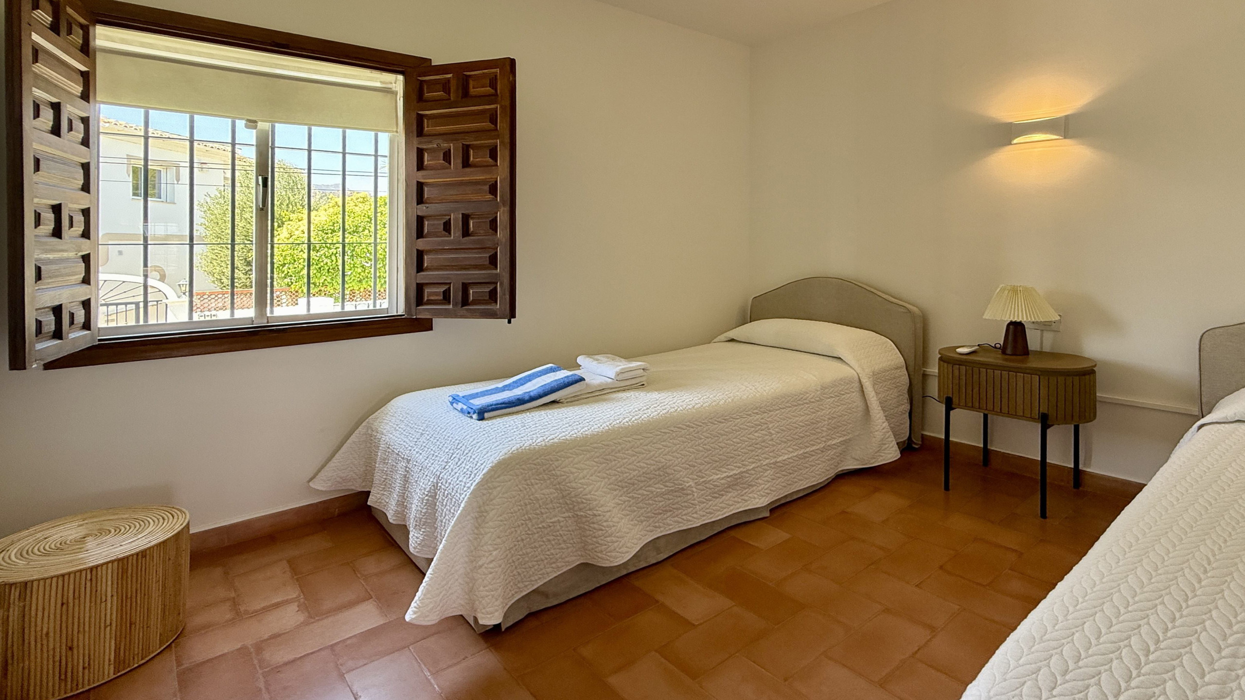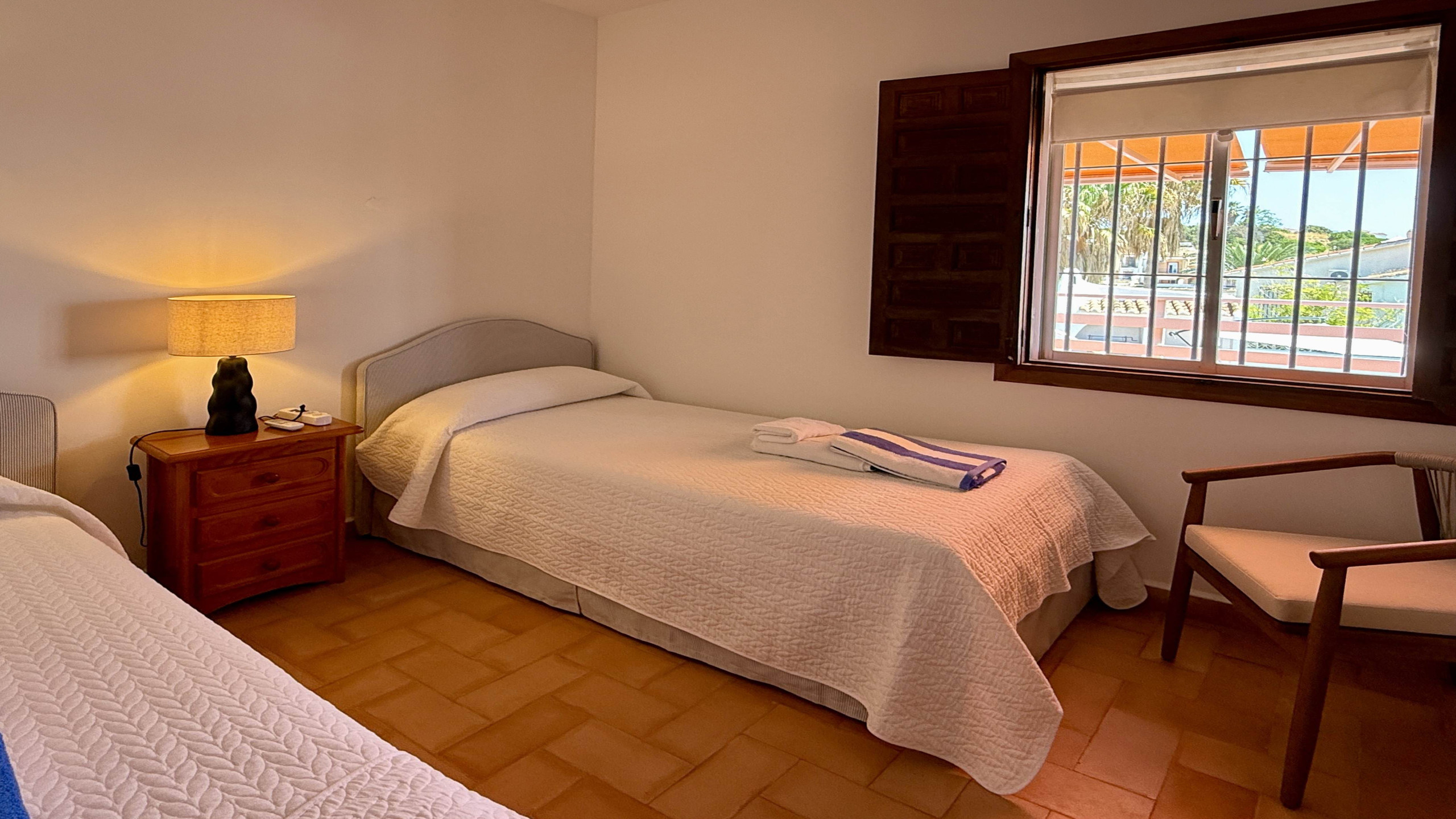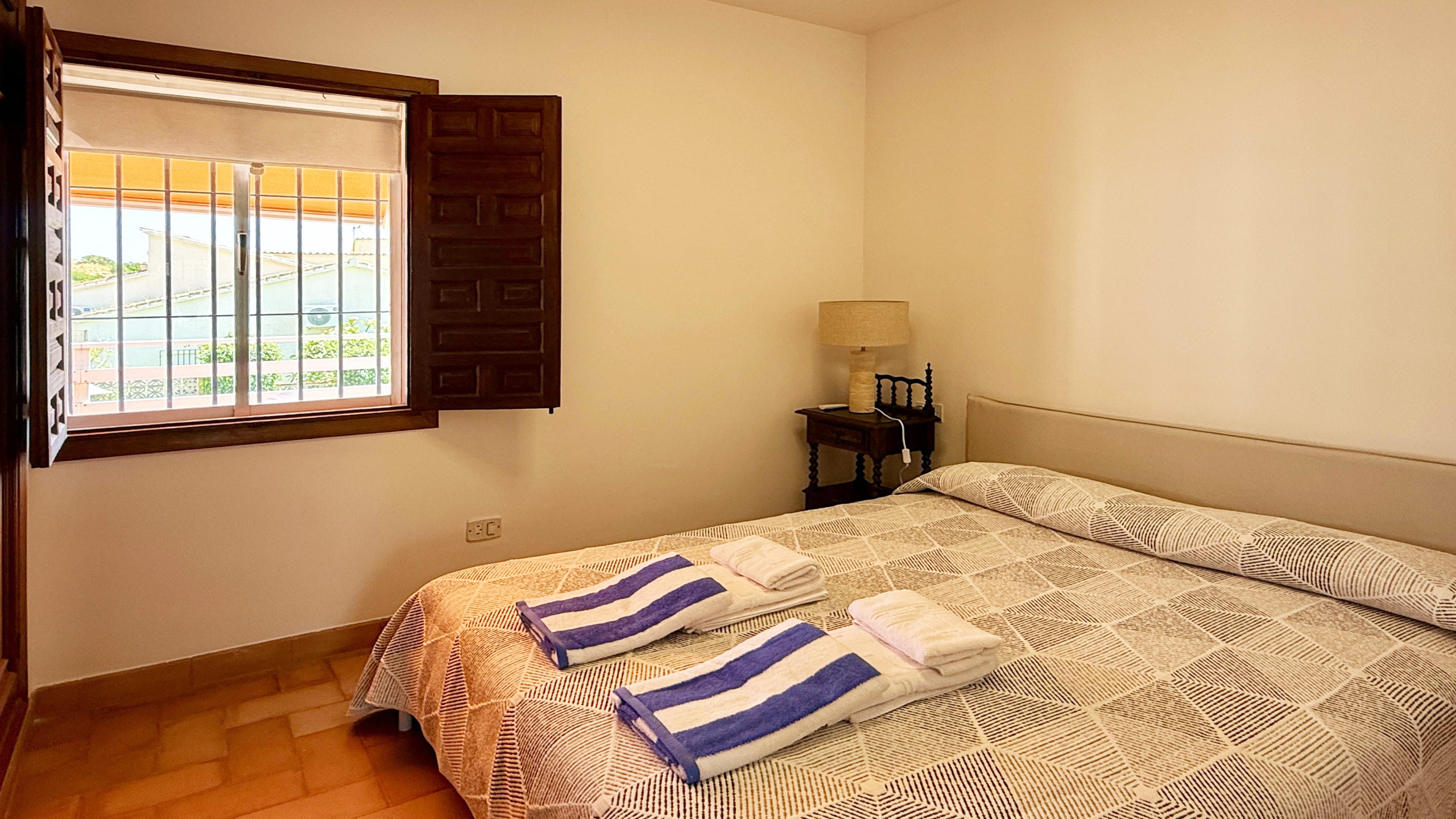 One of the double bedrooms and the twin bedroom share a south-facing terrace with 2 seats and distant sea views. The other double bedroom has a private terrace.