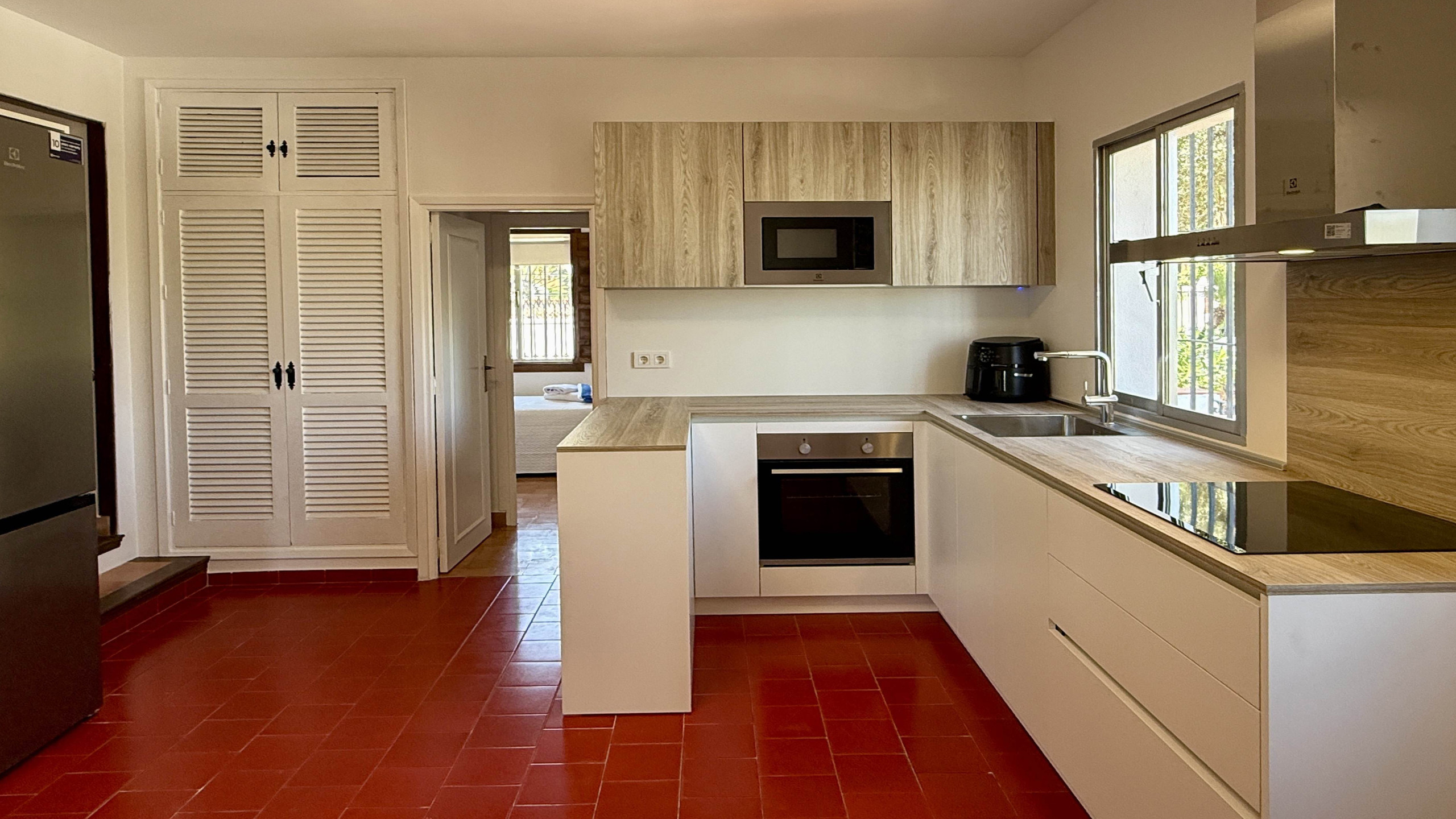 Inside, the villa is furnished with comfort in mind. The living room includes cosy sofas and armchairs, a dining area, and a smart TV with international channels. The independent, fully equipped kitchen provides everything needed for a relaxed holiday.