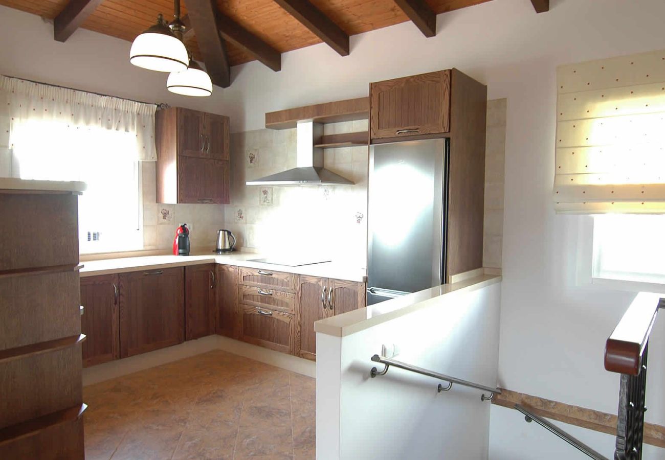 GROUND FLOOR: A very comfortable living/dining room is rustically decorated with an open fireplace, dining table for 8, sofa and satellite-TV. The kitchen is brand new and very well equipped with a ceramic hob, an electric oven, a microwave, a fridge/freezer, a dishwasher, and a washing machine. There is also a wonderfully tiled shower room with WC and wash basin on the ground floor.